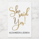 A modern gold script text with She Said Yes in a minimalistic style with your custom names below in a simple modern font.