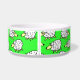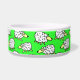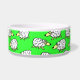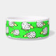 Sheep dog food bowl. Fun flock of sheep cartoon design on this pet food bowl. Ideal for dogs, especially sheepdogs. Green background.
