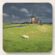 Plastic photo coaster with some sheep in the green grass in front of three windmills under a dark sky with rain clouds just before a spring storm in a landscape in Leidschendam, the Netherlands.
