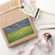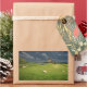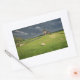 Rectangular photo sticker with some sheep in the green grass in front of three windmills under a dark sky with rain clouds just before a spring storm in a landscape in Leidschendam, the Netherlands.
