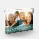 Simple and chic holiday photo keepsake features your favourite family photo overlaid with a sheer spruce green band along the bottom. "Merry Christmas" appears in white modern calligraphy script lettering.