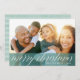 Simple and chic holiday photo card features your favourite family photo overlaid with a sheer spruce green band along the bottom. "Merry Christmas" appears in white modern calligraphy script lettering with your family name or names and the year at the lower right. Cards reverse to a variegated stripe pattern in pale sage green.