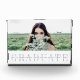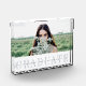 Modern graduation photo block features your favourite landscape orientated or horizontal photo on the front, with "graduate" displayed beneath in elegant grey-blue lettering. Personalise with your name, school and graduation year on a sheer white stripe overlay.