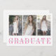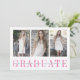 Modern graduation photo party invitation features three of your favourite photos aligned side by side, with "graduate" displayed beneath in elegant bright pink lettering for a pop of colour. Personalise with your name, school and graduation year on a sheer white stripe overlay. Cards reverse to reveal your graduation party details in matching colours. An elegant and modern choice for 2023 graduates.