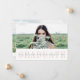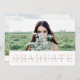 Modern graduation photo announcement features your favourite landscape orientated or horizontal photo on the front, with "graduate" displayed beneath in elegant blush pink lettering. Personalise with your name, school and graduation year on a sheer white stripe overlay. Cards reverse to an additional photo with a stripe along the bottom to personalise with the graduate's plans for college or career. An elegant and modern choice for class of 2022 graduates.