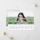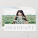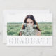 Modern graduation photo announcement features your favourite landscape orientated or horizontal photo on the front, with "graduate" displayed beneath in elegant grey-blue lettering. Personalise with your name, school and graduation year on a sheer white stripe overlay. Cards reverse to an additional photo with a stripe along the bottom to personalise with the graduate's plans for college or career. An elegant and modern choice for 2017 graduates.