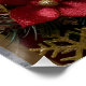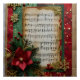 A layered card with textured red paper, gold accents, green leaf pattern, and sheet music. Adorned with golden snowflakes, red berries, pine branches, and a red bow with gold glitter edges, creating a festive Christmas theme.