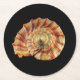 Round paper coaster boasting a photo of a spiral shell.