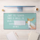beach cottage theme desk mat with customisable "may you always have a shell in your pocket and sand in your shoes" text in modern script white font, blue background and watercolor message in a bottle sea life graphic