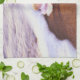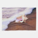Photograph of a pink and white conch shell on a dark brown sand beach with white foamy waves.