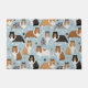 Cute Shetland Sheepdog dogs sit and stand and rollover with sable, tri-colour, merle and white coats with scattered dog bones and pawprints pattern.