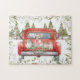 This fun watercolor Christmas puzzle features a family sheltie dog and puppies sitting in the back of a vintage red truck wearing a Santas hats. There is a holiday foliage border around the front side and in the inside as well.