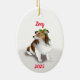Brown Sable Sheltie with a green holly on the dog's head. You can personalise with your dog's name. Designed and Illustrated by ©Jacqueline Schneider