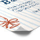 This mimosa bar sign features hand drawn illustrations of a lobster, sea shell, and champagne glass on a soft blue striped background.
