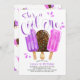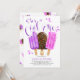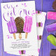 Popsicle Invitation for a your little girl's first birthday. The invite is hand lettered with "She's a Cool One" and has watercolor ice lolly pops on stick and a chocolate lolly with sprinkles. The template is set up for you to add your little girl's name and party details. The back has a colourful matching pattern of popsicles and cool splashes. Girly colour palette in pink purple and lilac.