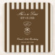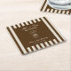 Birthday paper coaster featuring a hand-drawn coffee martini glass and coffee beans paired with elegant script and serif fonts in which your personalized information is written. The background is brown stripes on a light background. Check out our store for more items from this collection.