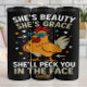 Embrace humour with this playful black tumbler, featuring a cartoon chicken sporting sunglasses and the funny text "She's Beauty, She's Grace, She'll Peck You in the Face." Perfect for casual drinkware, this graphic adds a quirky and fun touch to your wardrobe. Ideal as a unique gift for chicken lovers or anyone with a sense of humour.