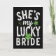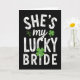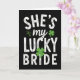 This card sets the phrase “SHE’S my LUCKY BRIDE” right in the center on a deep black background, making the message feel like it’s meant for one special person. “SHE’S,” “LUCKY,” and “BRIDE” appear in large, thick white letters with a lightly worn texture, while “my” sits between them in a smaller, flowing white word that reads like a soft aside. Bright lime green details ☘️ weave through the lettering like little tokens passed between partners, adding a flirty, close-to-the-heart touch. A three-leaf clover replaces the “U” in “LUCKY,” turning the word itself into a lucky charm. Another small shamrock hovers just above the “Y,” like a wink tucked into the line. In “BRIDE,” a long green shamrock becomes the stem of the “I,” and a small green asterisk-like flourish adds a final spark of color 💚. The overall layout stays centered and high-contrast, with white text stacked neatly and green accents punctuating the words against the black field. The lime green clovers and flourish stand out sharply, with the clover-shaped “U” and the shamrock “I” stem clearly visible in the middle of the design.