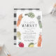 This cute "She's off the market" farmer's market bridal shower invitation features a white background with vegetables and fruits in watercolor. The reverse side features a white background with black buffalo/gingham check patterns. Personalise for your needs. You can find matching products at my store.