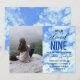 She's On Cloud Nine! Bridal shower invitation featuring fluffy white clouds against a crisp blue sky. Photo template via Pixabay licensed under CC0 and must be replaced with your own photo