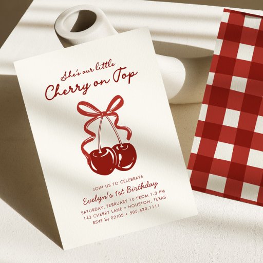 Celebrate your little girls birthday in the preppiest (but simplest) of ways with our incredibly cute Cherry First Birthday Invitation! With beautiful bold red colors, dainty bows, and modern flair.