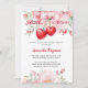 An elegant white background, decorated with a pink bow with cherries and pink flowers. Personalise and add a name and party details. Text: She's the Cherry on top