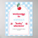 Welcome your party guests with this sweet "Cherry on Top" baby shower poster! Featuring a whimsical cherry theme, retro-inspired typography, and a soft blue gingham border, this delightful poster sets the perfect tone for a warm welcome to the celebration.