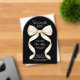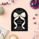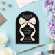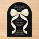 Elegant Black Bow She's Tying the Knot Bridal Shower acrylic Invitation. Sweet feminine charm beautiful watercolor painted white sand taupe bow with curled ribbon edges set against black background. Calligraphy script wording let's everyone know that she's tying the knot. Invite friends and family to an enchanted girly coquette bridal shower with bows galore! Pretty bow pattern on the back of the invitation. Templates are easy to edit with all the bridal shower details.