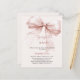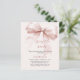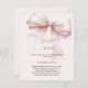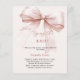 A soft pink background, decorated with rose gold coloured bow. Personalise and add a name and party details.