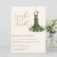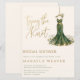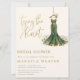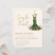 Celebrate the bride-to-be with this elegant and unique bridal shower invitation. Featuring a stunning watercolor emerald green gown with intricate gold embroidery detail, this design is suspended from a gold hanger and surrounded by a whimsical bed of white daisies.
