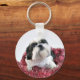 Black and white Shih Tzu in red garland Christmas photo keychain