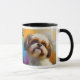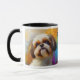 This bright and very colourful mug celebrates the adorable Shih Tzu dog! Two sides of the mug have a beautiful portrait of a little Shih Tzu against a brightly splashed background. Predominant colours include orange, gold, blue, and more. At the centre is script that says Shih Tzu, but you may change it or even personalise it, if you wish. This mug will get noticed!