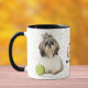 "Shih-Tzu kisses fix everything" declares this mug for the Shih-Tzu Dog owner. The image on each side is a portrait of an adorable Shih-Tzu with a green tennis ball. The images and text are placed on a white background that is sprinkled with gold confetti.