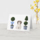 This greeting card features a watercolor portrait of a cute shih tzu dog sitting in between two chinoiserie style topiaries.