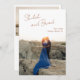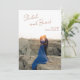 Modern wedding save the date card featuring a simple design with your names in an elegant script at the top left and your date, city and state below to the right, over your favourite vertical photo. The template includes a sheer overlay along the top to help the text stand out against your photo and may be removed in the design editing tool. The back has a second horizontal picture along with additional details in copper / brown. This minimal, monochromatic design works well for a variety of wedding styles and themes. If you prefer, you may change the colours in the design editing tool.