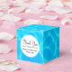 Wedding favour box (tiny size - 2 inch by 2 inch) with a photograph of clear blue pool water, with shimmering reflections. A white circle layered over top with your text inside.