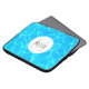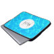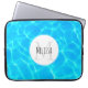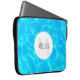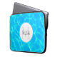 Laptop sleeve with a photograph of clear blue pool water, with shimmering reflections. A white circle layered over top with your name and initial inside.