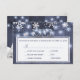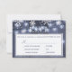 Editable text wedding RSVP with menu options featuring rustic winter wonderland, white snowflakes and twinkle hanging lights on dark blue grey barn wood background. Ideal for your winter elegant rustic country | wonderland themed wedding.
