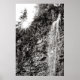 A black and white photograph of a waterfall at a stone wall basin, with trees at the ridge line, and the sun shining at the crest of the landscape scene.