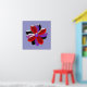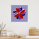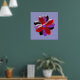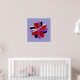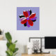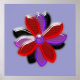This pretty print features a digital image of a daisy flower with purple, red and black coloured petals with a purple centre. The petals look like they are made of shining plastic that has caught the light and caused an iridescent effect. The background is a calming blue colour and there is a purple border around the print.