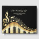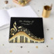 Black and gold illustration of a music keyboard with notes and clef and golden shining stars