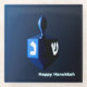 A modernistic, metallic blue dreidel against a dark, night-like background. Two of the Hebrew letters found on a dreidel, nun and shin, glow brightly. Text reading "Happy Hanukkah" also appears in glowing blue and white.
