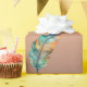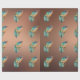 A beautiful gift wrap of a shiny copper looking background and an assortment of coloured feathers that contract.