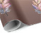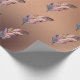 A beautiful gift wrap of a shiny copper looking background and an assortment of coloured feathers that contract.
