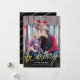 Personalised Christmas photo greeting card with "be merry" in a trendy, faux gold foil effect calligraphic script overlay. Back of the card decorated with thin gold stripes on a black background. Add your own family photo and holiday greeting.