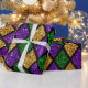Shiny green, purple and golden glittering paillettes diamonds background pattern fabric with empty space for copy, room for text. Mardi Gras holiday poster backdrop.