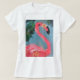 I drew a big, bright pink flamingo with a long neck and black beak. There’s gold sparkles all over it, and green leaves with gold dots behind it. The blue background makes it look like a sunny day. It’s super fun and sparkly!