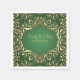 Elegant personalised wedding napkin design featuring shiny faux gold ornaments on a emerald green background and a blank area for your text.