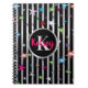 Cute personalised spiral notebook design featuring shiny confetti shaped stars in different metallic colours on black and white vertical stripes and a black circle with silver frame for your text. The text is fully customisable.