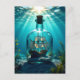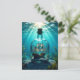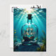 A maritime postcard with a ship in a bottle sitting in the bottom of the sea with sun rays beaming down. A nice postcard to say hi and keep in touch with a friend or family member.